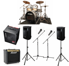 ドラムセット.ギターアンプ.ベースアンプとマイク.音響ミキサー.音響スピーカーの本格的音響セットが付いてこの価格。無料配送地域を大幅に拡大!セッティング.リハーサル立会い調整込み。 | ドラムセット.ギターアンプ.ベースアンプのお得なバンドセット価格。 1日1組限定.無料配送地域あり。余興やサプライズ演奏に。ドラムセット¥7000/ギターアンプ¥4200/ベースアンプ¥4200/キーボード¥5000 |